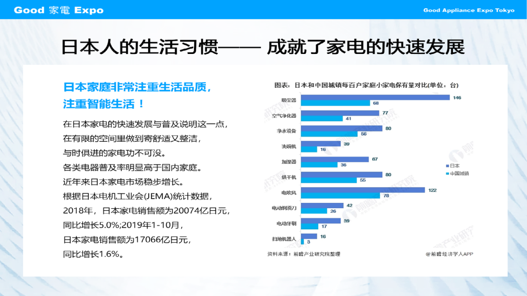 以振兴地区的经济为理念,将举办新展会“GOOD家电展”。随着时代发展,越来越多的电子产品进入人们的生活,人们越来越追求细致的生活,小家电成为人们提高生活质量和生活幸福感的首要选择。展出的产品大多为小家电设施,如扫地机器人、电动牙刷、多功能料理机等,用自动化代替手动操作、减轻生活家务负担让“懒人经济”趋势成为主流。办公室、购物、旅游、休闲体验多方面合一,在零售业、餐饮业、服务业领域、办公区域,着重开展体验式消费、提高揽客的能力。来场人员大多数以大型商超负责人、家居中心负责人、连锁店采购商、餐厅负责人、酒店负责人、百货公司、商业设施等有相关合作需求的企业来参观学习,并寻找业务合作企业。