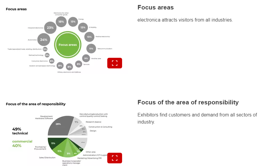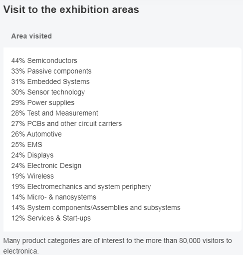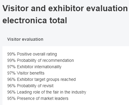 届时,来自全球各地的知名电子企业将推出自己的最新成果;而为数众多的专业观众亦将不只流连于令人眼花缭乱的新产品、新技术发布,他们更多的是搜寻自己中意的客户、签订合作协议。齐全的参展产品和服务范围、展会在电子业界的领先地位、展会邀请业界重量级人物参加和展商的国际性是electronica最吸引人的因素2018年展会期间,有来自50多个国家的3,400家参展商,其中59%来自海外,共接待专业观众超过80000名。展商和观众都对electronica展的成绩表示满意。调查显示,齐全的参展产品和服务范围、展会在电子业界的优秀地位、展会邀请业界重量级人物参加和展商的国际性是electronica吸引人的因素。