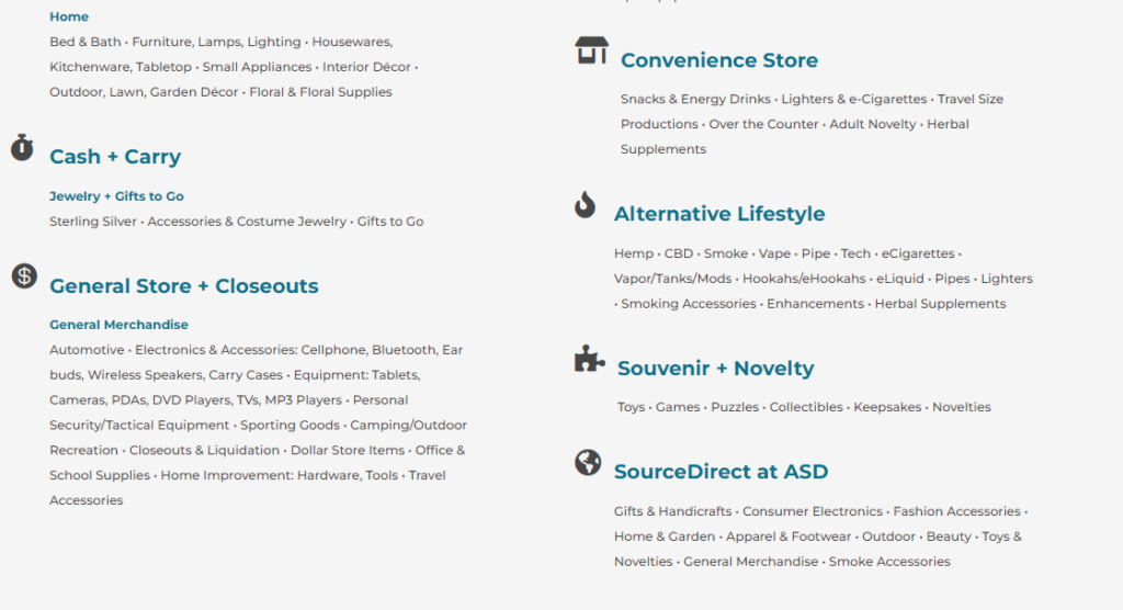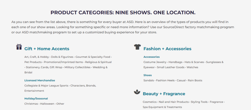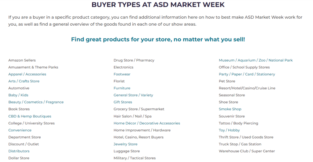 展览会荟萃了各类新产品,日用消费品、礼品,代表了相关行业的技术走向和消费品的流行趋势,是美国日用消费品经销最重要的流通场所之一,全美国各主要百货公司、超级市场及中小型连锁店每一年都会参加ASD展,制定采购计划,洽谈订货。