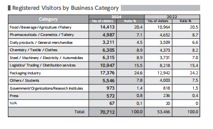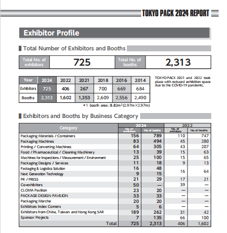 本展以使用于各行各业的包装材料、包装机械为中心,网罗了设计,采购,生产,流通,销售,消费,废弃物再生利用等包装的一切。上届参展分类的细目中,"包装资材和容器"为37.6%,"包装机械"为24.8%,两者保持了均衡的世界少有之存在的综合包装展。驱使本协会会员数约1,200家单位的网络和信息,实施宣传活动。特别是本次将通过与海外主要媒体的合作、世界各国的大使馆、包装团体、相关机关等进行展商信息等的全球发信,向众多的用户积极宣传,进一步展开参观促进活动